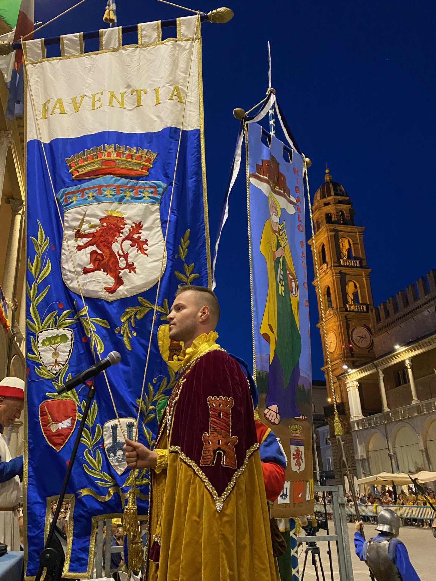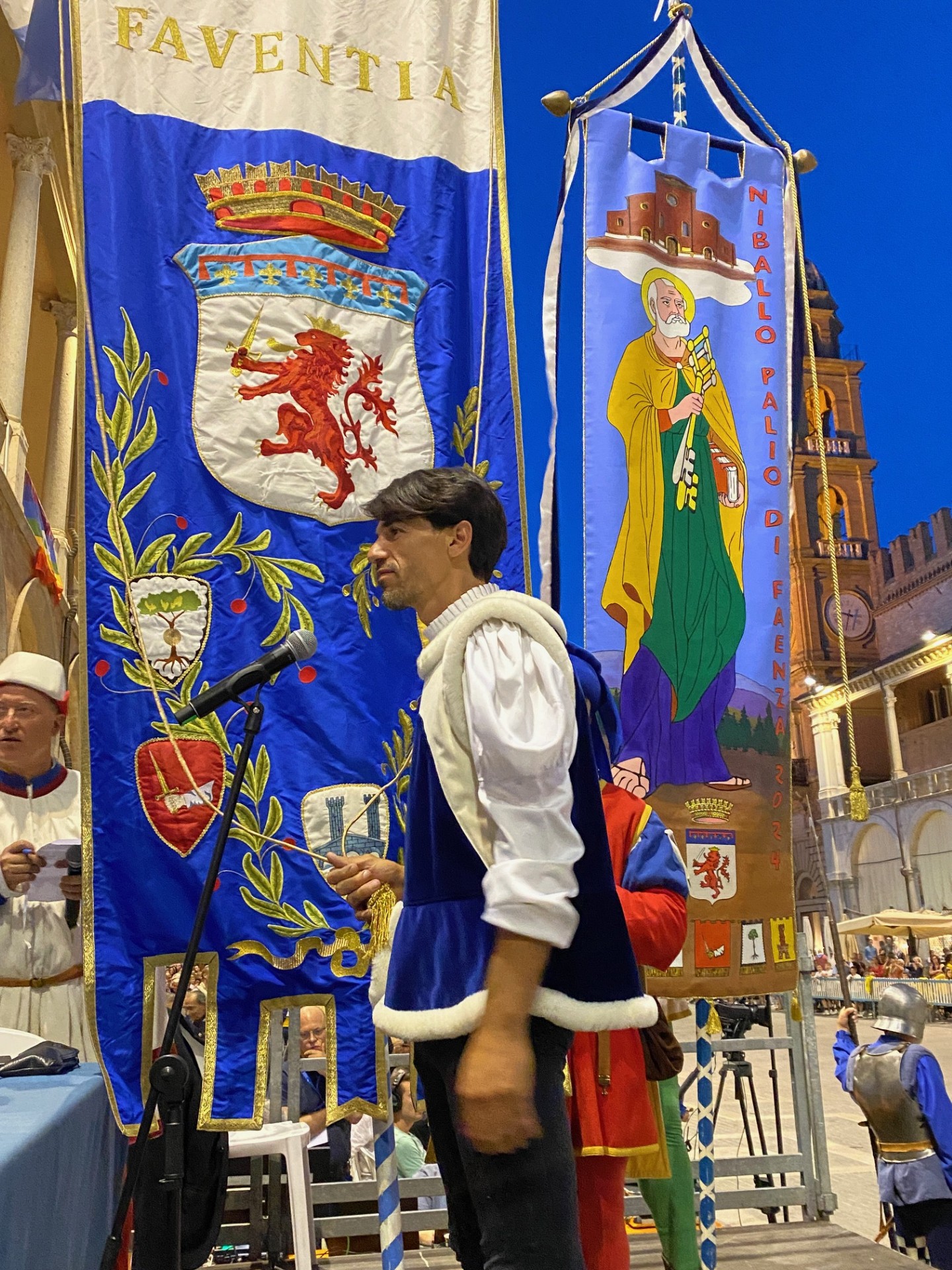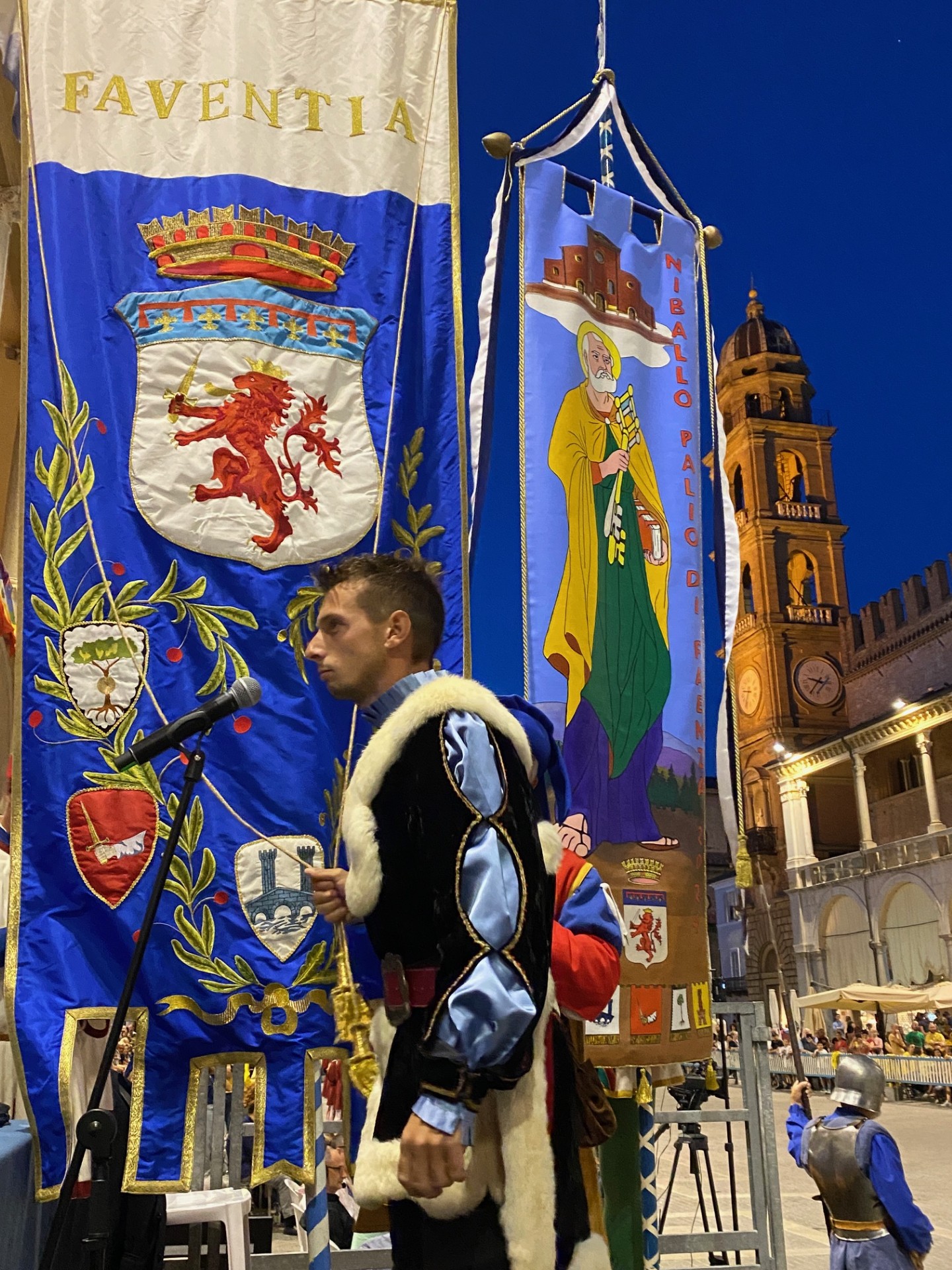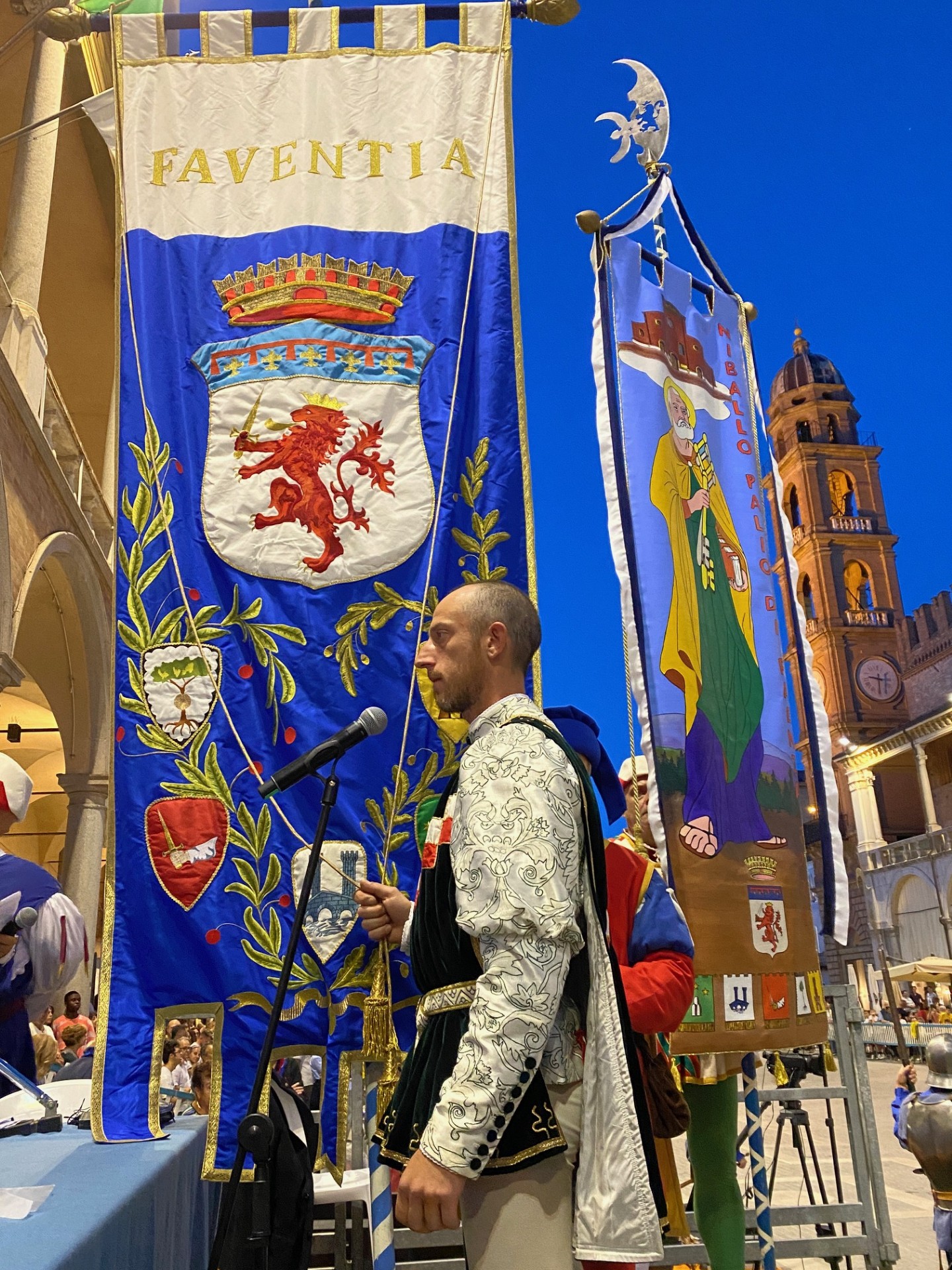 Un pubblico giubilante ha accolto questo fine settimana il Torneo Alfieri Bandieranti e Musici in programma in Piazza del Popolo. La serata del 15 giugno ha visto scendere in Piazza gli atleti delle Specialità Singolo, Piccola Squadra, Grande Squadra e Musici, mentre le gare del 16 giugno sono state aperte dal Giuramento dei Cavalieri che correranno il Niballo Palio di Faenza il prossimo 23 giugno per cui sono riconfermati i nomi dell’edizione 2023. Marco Diafaldi ha giurato per il Rione Verde, Luca Innocenzi per il Borgo Durbecco, Matteo Tabanelli per il Rione Nero, Matteo Rivola per il Rione Rosso e Gertian Cela per il Rione Giallo. Al Giuramento sono poi seguite dalle gare nella specialità Coppia tradizionale. Entrambe le gare serali sono state trasmesse in diretta streaming sui canali del Niballo (YouTube, Fb e sito www.paliodifaenza.it) e sono sempre visibili in versione integrale.